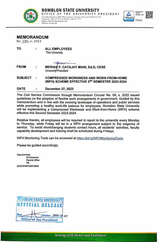December 27, 2023 – Romblon State University (RSU) is implementing a new Compressed Workweek and Work-from-Home (WFH) scheme for the second semester of 2023-2024. Announced by University President Dr. Merian P. Catajay-Mani, the policy requires employees to work on campus Monday to Thursday, with Fridays designated for WFH.